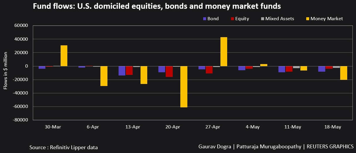 截至5月19日当周,投资者卖出30.5亿美元的美国市政债券基金,撤出55.2亿美元的应税基金。