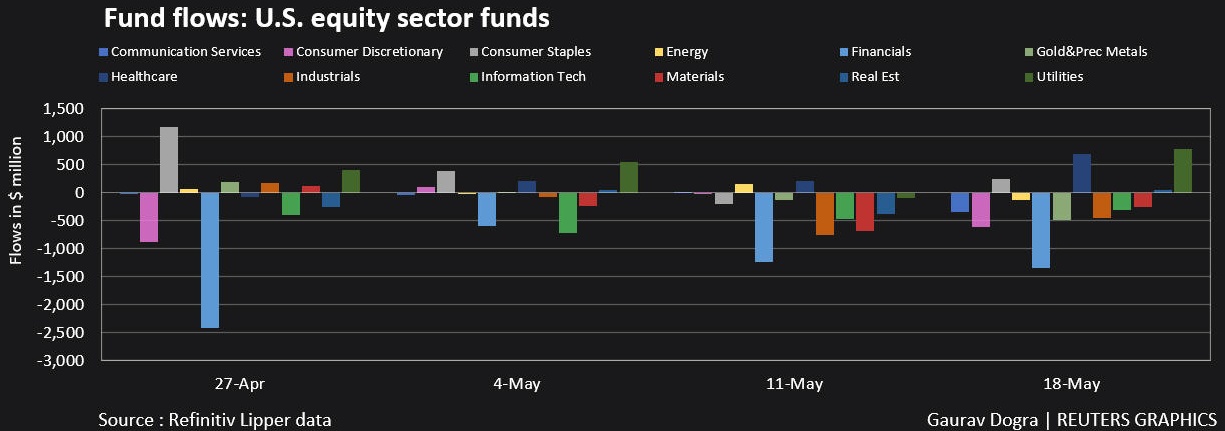 行业基金中,金融类股和非必需消费品股分别流出13.4亿美元和6.1亿美元,但公用事业和医疗保健股分别吸引7.8亿美元和6.9亿美元的资金流入。