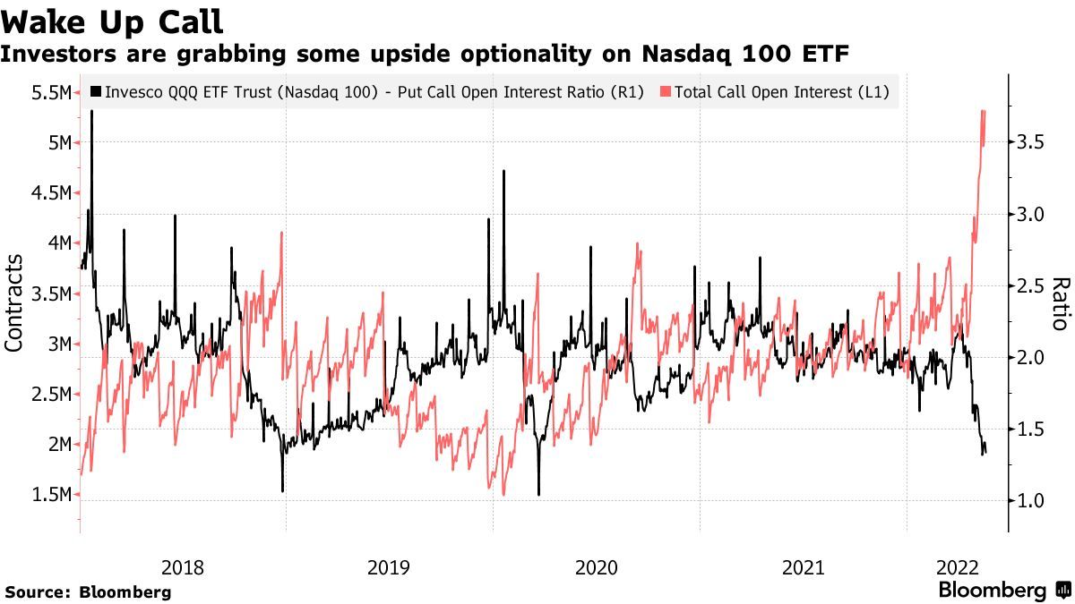 期权市场也预示着潜在的反弹。追踪纳斯达克 100指数的纳指100ETF(QQQ.US)期权数据显示,基于未平仓合约的看跌/看涨比率(put-to-call)最近触及两年来最低,未履约的看涨期权数飙升至2008年以来的最高水平。看跌/看涨比率下降通常是投资者正在为上行趋势做好准备,是看涨信号。