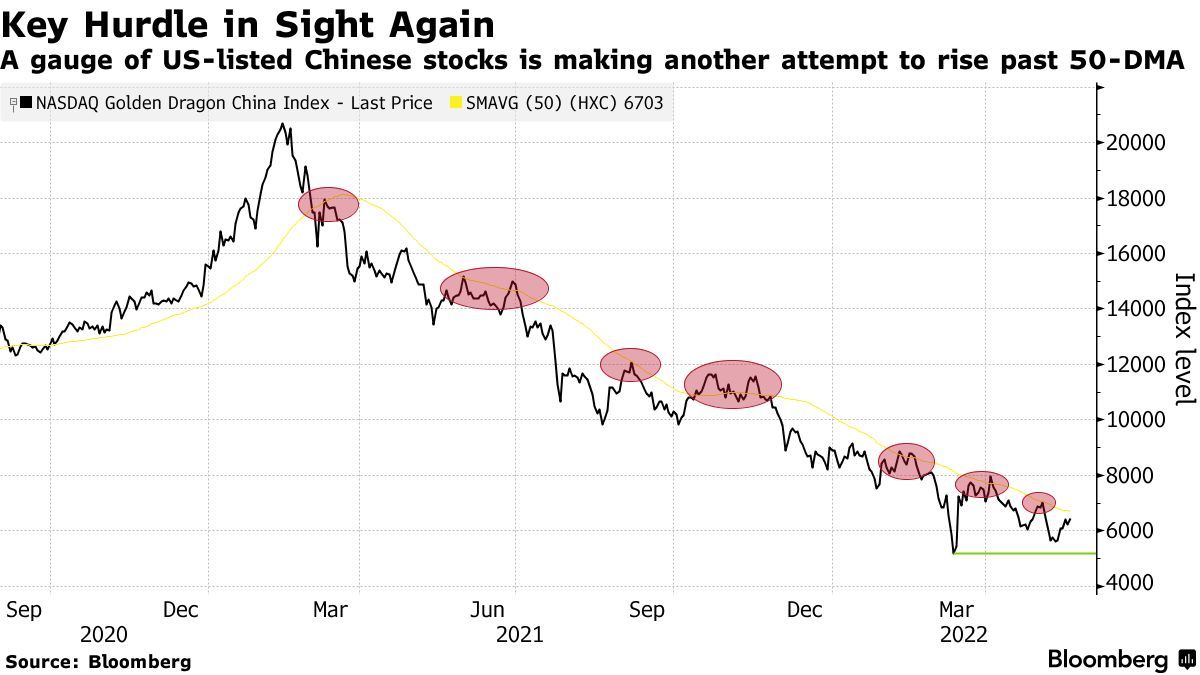 另外,从历史数据上来看,一直与纳斯达克100指数呈正相关的纳斯达克金龙中国指数再次测试50日移动均线,这是该指数今年未能持续突破的关键技术性阻力位。