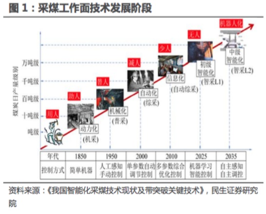 我国采煤阶段经历了动力化、机械化、自动化、信息化的演变。目前,我国正处于从信息化向智能化升级的阶段。据《我国智能化采煤技术现状及带突破关键技术》,预计到2025年左右,将实现初级智能化采煤作业;到2035年左右实现半自助控制的中级智能化采煤,基本跨入智采工作面无人化作业阶段。