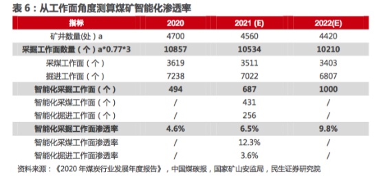 目前,智能工作面的整体渗透率仍然较低,据《2020年煤炭行业发展年度报告》显示,2020年底全国煤矿数量4700个,渗透率仅为4.6%。若以工作面角度测算,民生证券测算,到2022年,智能化采掘工作面渗透率将达到9.8%左右,较2020年增加超500个工作面。可见我国煤机行业智能化需求潜力巨大。