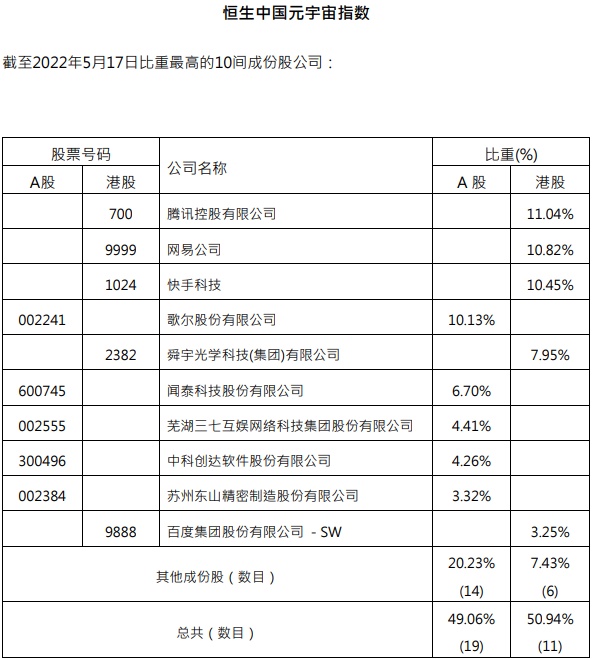 智通财经APP获悉,5月23日, 恒生指数公司推出恒生中国元宇宙指数及恒生沪深港基因及肿瘤学指数。其中,截至2022年5月17日,中国元宇宙指数成分股中占比最高的前5家公司为腾讯控股(00700)、网易-S(09999)、快手-W(01024)、歌尔股份(002241.SZ)、舜宇光学科技(02382),A股成分股总占比为49.06%,港股成分股总占比为50.94%;沪深港基因及肿瘤学指数成分股中占比最高的前5家公司为药明康德(603259.SH)、恒瑞医药(600276.SH)、石药集团(01093)、君实生物(688180.SH)、复星医药(600196.SH),A股成分股总占比为73.61%,港股成分股总占比为26.39%。