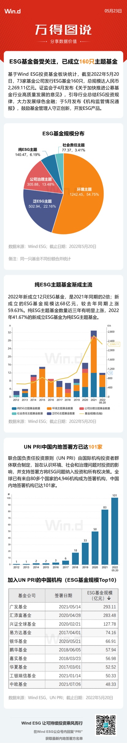 Wind发布数据表示,基于Wind ESG投资基金板块统计,截至2022年5月20日,73家基金公司发行ESG基金160只,总规模达人民币2269.11亿元。其中,2021年以来新发产品数量超过2017-2020四年的总和,ESG基金资产管理规模达2269亿元,较2020年底增长了20%。