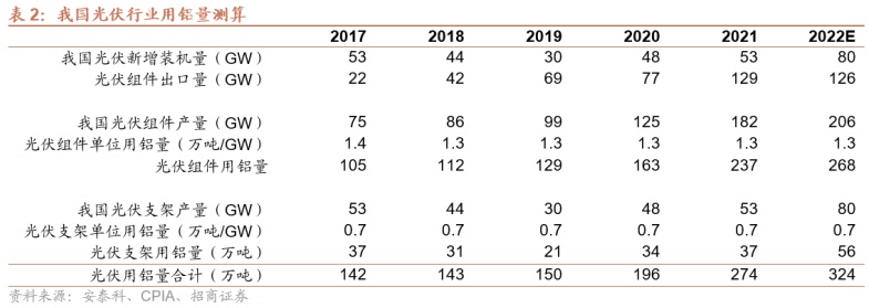 此外,发展光伏行业亦将提振铝的需求预期。根据安泰科测算,光伏边框用铝量约1.3万吨/GWh,光伏装机支架用铝量约0.7万吨/GWh。我们预计2022年国内新增光伏装机量80GW左右,据此测算2022年我国光伏行业用铝量将达到324万吨,同比增长18%,增量约50万吨。