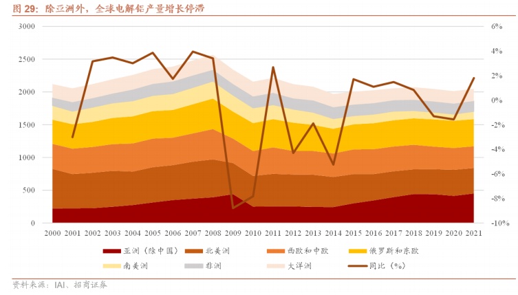 可见,过去20余年,除亚洲外,全球各区域的电解铝产量基本处于增长停滞的状态。叠加“碳中和”背景,很难想象未来还有国家或地区会开足马力大幅增加电解铝产能。