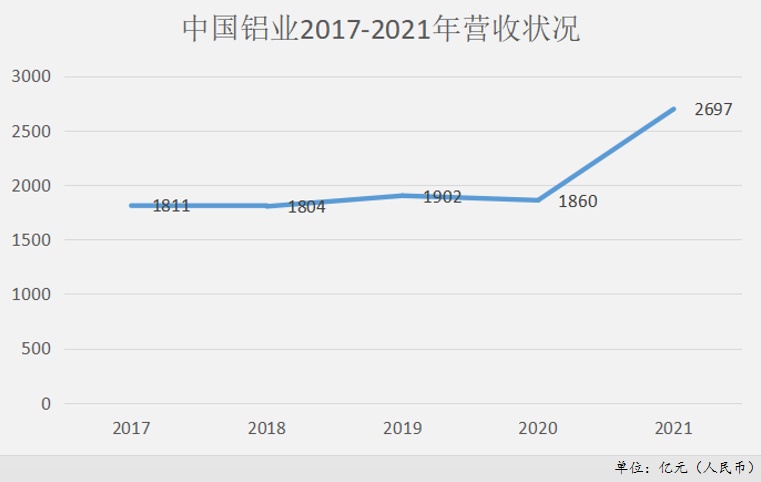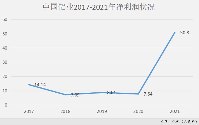 同期,中国铝业的盈利表现亦呈一定波动性,上述期内净利润分别为14.14亿元、7.09亿元、8.61亿元、7.64亿元、50.8亿元。其中,2021年公司净利润同比增逾5倍。