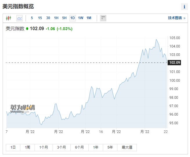 在上周出现近两个月来首周下跌之后,美元指数(DXY)本周开局不利,投资者减少对美国利率上升将带来更多美元升幅的押注。截至发稿,美元指数跌1.03%,报102.09。