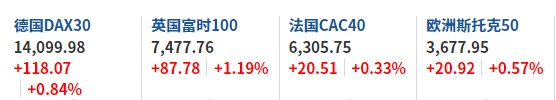 2. 截至发稿,德国DAX指数涨0.84%,英国富时100指数涨1.19%,法国CAC40指数涨0.33%,欧洲斯托克50指数涨0.57%。