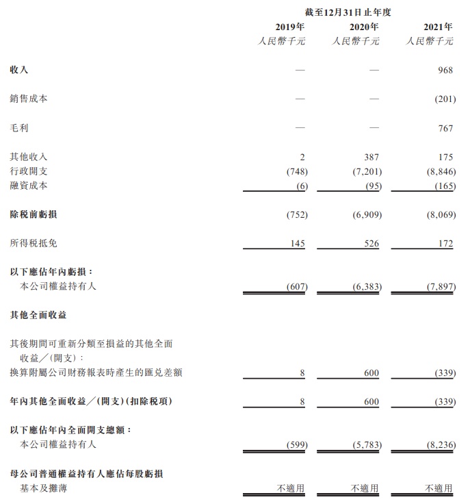 根据该公司财务报表显示,该公司2021年收入为96.8万元(人民币,下同),2019-2021年度税前亏损分别为75.2万元、690.9万元、806.9万元。