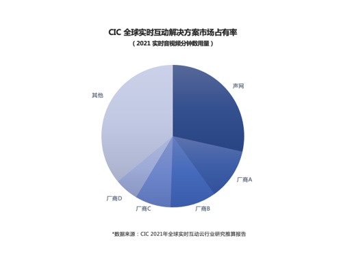 根据独立第三方行业研究与分析机构 CIC 灼识咨询发布的《2021 年全球实时互动云(RTE-PaaS)行业研究报告》(以下简称“报告”)显示,作为实时互动云服务行业开创者和引领者,声网继续蝉联全球实时互动解决方案市场份额第一,根据 2021 年实时互动解决方案支持的实时互动音视频分钟数及年度营收两个指标计算,声网的全球市场占有率均遥遥领先其他服务商。