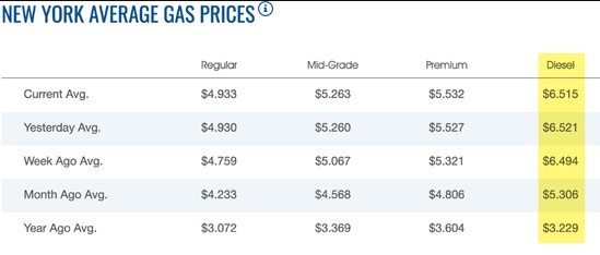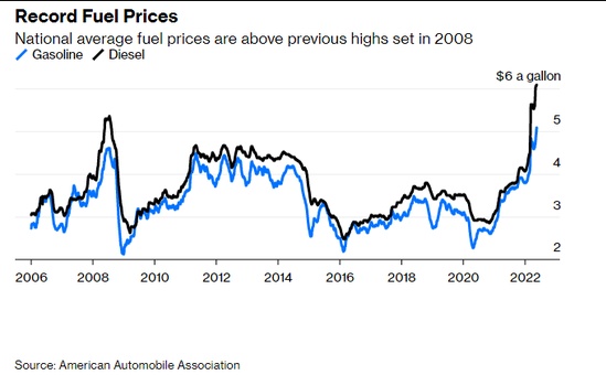 根据美国汽车协会(AAA)的数据,截至上周日(5月22日),全美柴油的平均价格为每加仑5.56美元,与上周创造的5.58美元的记录相差无几。这标志着比一年前增加了75%,还有经济学家预测到今年夏天结束时价格可能飙升到每加仑10美元。