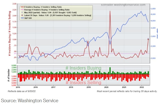 根据专业跟踪上市公司内部人士股票买卖情况的Washington Service统计的数据显示,今年5月份,超过1100名上市公司高管买入了自家公司的股票,内部人士买卖股票比例从4月份的0.43上升至1.04,这有望成为自2020年3月以来买卖股票比例首次超过1的一个月。其中,包括星巴克(SBUX.US)临时首席执行官Howard Schultz和英特尔(INTC.US)首席执行官Patrick Gelsinger在内的上市公司高管都在这段市场暴跌期间买入了自家股票。