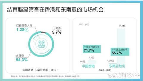 另一方面,目前结直肠癌筛查在亚洲存在巨大增长机会。根据弗若斯特沙利文的研究报告,2019年中国香港及东南亚地区结直肠癌高风险人群达到1.28亿,其中未经筛查比例为94.3%。香港结直肠癌筛查市场规模预计将从 2020 年的130万美元增长至2030年的2.9亿美元,十年复合年增长率为71.7%。同期,东南亚同一市场规模预计将从2020年的3340万美元增长到2030年的 27.9 亿美元,复合年增长率为55.7%。