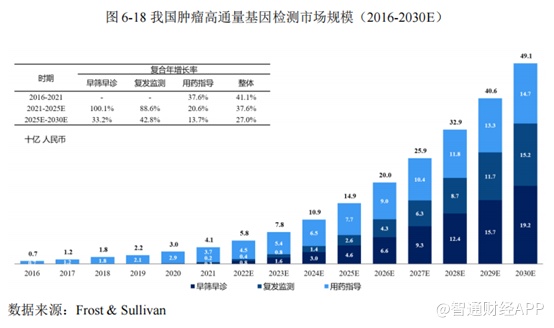 在政策的大力支持下,市场空间快速扩张。根据Frost & Sullivan数据,国内肿瘤高通量基因检测市场规模已由 2016年的7亿元至增至2021年41亿元,复合年增长率为41.1%;预计2025年和2030年,市场规模将分别达到149亿元和491亿元,呈现快速增长态势;其中肿瘤复发监测、早筛早诊的未来市场空间预计成为行业发展的新动能。