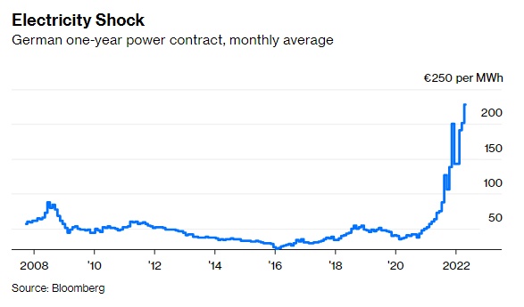 俄乌冲突推高了天然气和煤炭价格,是这场危机的主要驱动因素。法国的低核电产量也加剧了这种情况:国有的法国电力公司(electrite de France SA)最近将其2022年核电产量指导下调至不到300太瓦时,较10年前下降了30%以上。