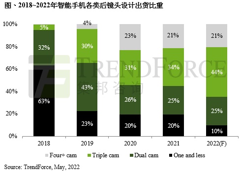 智通财经APP获悉,据TrendForce集邦咨询研究显示,2022年智能手机相机模组出货量将上调至50.2亿颗,年增5%。由于整机性价比是消费者购买的主要依据,相较五镜头设计、上亿画素的主镜头等高规格方案,成本最终仍会转嫁到厂商端,销售表现难获提升,故今年三镜头依旧为主流设计,预估将占整体出货量超过四成比重,仅部分机种则会采用四镜头设计来做为规格差异化,而双镜头以下的产品数量将会减少,以入门款机种为主。