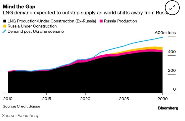 据悉,欧洲计划在今年年底前将从俄罗斯进口的管道天然气量减少三分之二,减少的量将通过来自美国和非洲的液化天然气进行替代。这一计划正急剧加剧市场对这一燃料的抢夺。此外,市场还预计中国的新冠疫情会在2022年晚些时候结束,这应该也会刺激市场对天然气的需求。