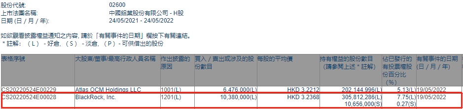 智通财经APP获悉,香港联交所最新资料显示,5月19日,贝莱德减持中国铝业(02600)1038万股,每股作价3.2368港元,总金额约为3359.80万港元。减持后最新持股数目约为3.06亿股,最新持股比例为7.75%。