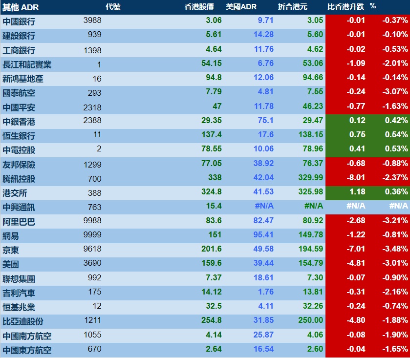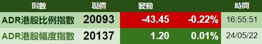 智通财经APP获悉,周二美股三大指数涨跌不一,港股ADR指数下跌,按比例计算,收报20093点,较香港收市跌43.45点或0.22%。