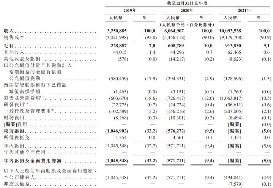 于2019年、2020年及2021年,药师帮收入分别约为32.509亿元、60.649亿元及100.935亿元人民币。同期,毛利分别约为2.289亿元、6.088亿元及9.138亿元人民币。