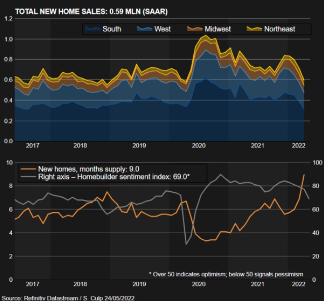 美国商务部周二公布的销售数据显示,美国4月新屋销售总数年化为59.1万户,低于预期的75万。该数据连续第四个月下滑,加上上周公布的数据,显示4月独栋房屋建造许可大幅下降,且成屋销售持续疲弱,暗示楼市需求正在降温。