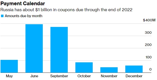 在2022年剩余时间里,俄罗斯总共还需支付约10亿美元的票面利息,但由于每周石油、天然气和其他大宗商品的销售,俄罗斯有大量现金。