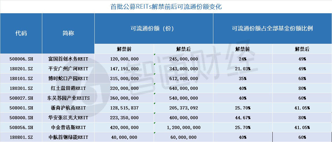 份额占比方面,红土盐田港REIT、华安张江光大REIT解禁后,可流通份额占全部基金份额比例高达80%。