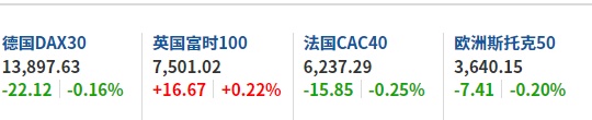 2. 截至发稿,德国DAX指数跌0.16%,英国富时100指数涨0.22%,法国CAC40指数跌0.25%,欧洲斯托克50指数跌0.20%。
