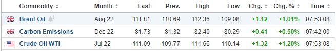3. 截至发稿,WTI原油涨1.20%,报111.09美元/桶。布伦特原油涨1.01%,报111.81美元/桶。