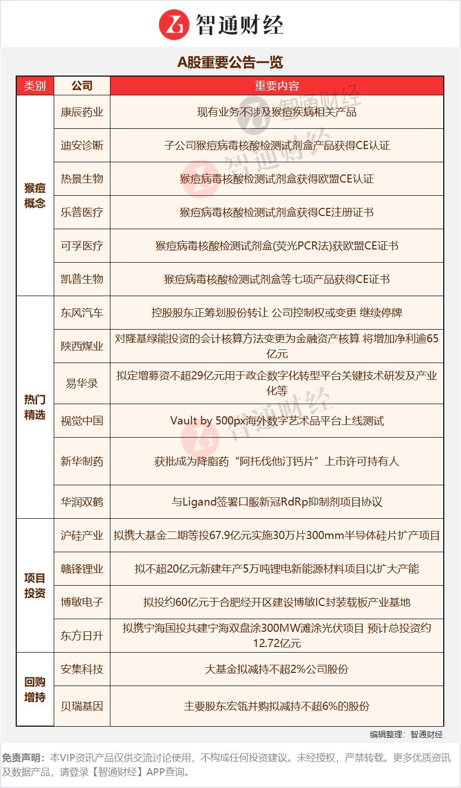 (4)迪安诊断(300244.SZ):子公司猴痘病毒核酸检测试剂盒产品获得CE认证。