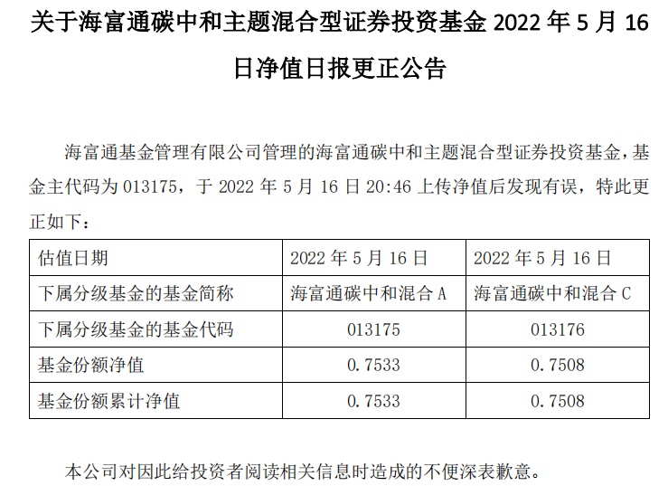 智通财经APP获悉,5月17日,海富通碳中和主题基金发布公告称,前一天(5月16日)上传的净值有误,并将0.7533元修正至0.7508元。