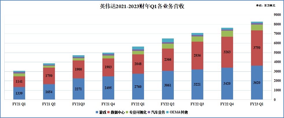 最新财报数据显示,英伟达Q1总营收为82.88亿美元,同比增长46%,超市场普遍预计的81亿美元。在“游戏业务+数据中心业务”两大巨轮驱动下,Q1总营收再度创下新高,两大核心业务营收同样创下历史新高,其中数据中心业务营收规模时隔6个财季再度超越游戏业务。在上半年供应链持续恶化的情况下,能实现如此规模营收彰显了英伟达绝对的GPU领导者实力。
