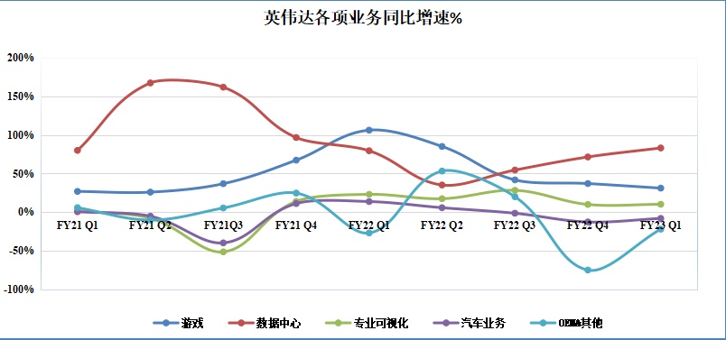 英伟达CEO黄仁勋在业绩新闻稿中评论道:“在充满挑战的宏观环境背景下,英伟达在数据中心和游戏领域取得了创纪录的业绩。虽然游戏业务营收创新高,但数据中心已经是英伟达旗下最大的平台。”在业绩电话会上,他还表示,预计数据中心还将创新高,对下半年怀有热情与期待。