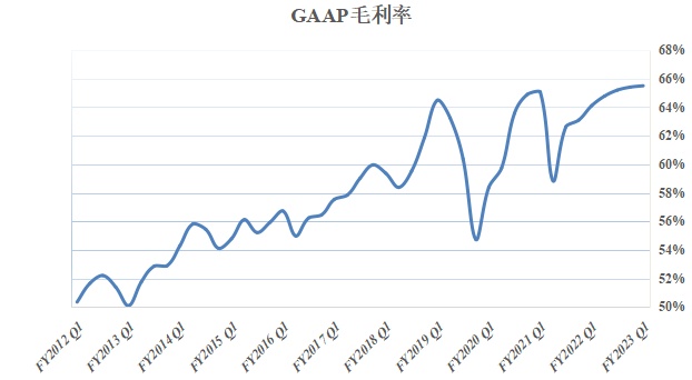 毛利率往往是反应企业盈利能力的最直观数据之一,专注于高性能独立显卡的英伟达凭借其产品超强的性能,以及品牌效应带来的溢价比例,GAPP准则下毛利率长期保持在55%超高比例以上,在第一财季更是创下历史新高到达65.5%。