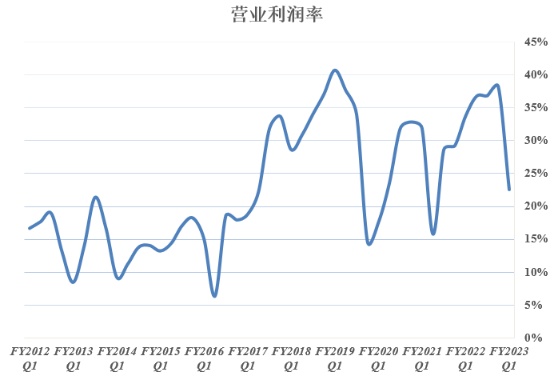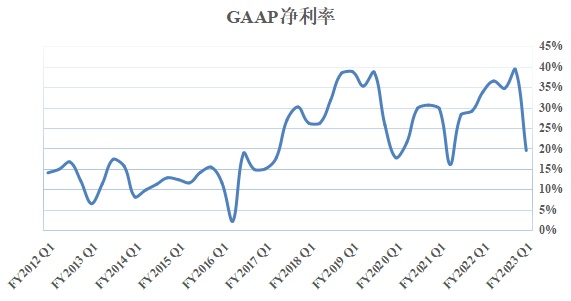 第一财季英伟达研究与开发成本,以及销售、一般成本与管理成本有所增加,这可能反映出美国高通胀率对企业经营造成压力,不得不在维护及提高经营效率上耗费更高成本,据媒体近日报道,为节省开支,英伟达已放缓招聘步伐。叠加第一财季13.5亿美元巨额“分手费”,英伟达营业支出相比去年同期大幅增长,因此第一财季GAAP营业利润率降至22.5%,相比于上年同期33.7%有所下滑。