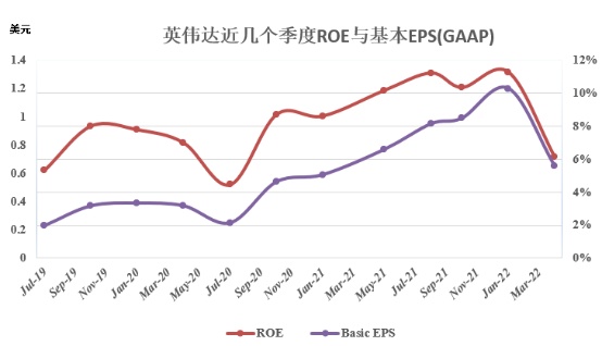 英伟达第一财季净利润为16.18亿美元,同比下降15%,主要因收购ARM失败需支付13.5亿美元“分手费”(收购终止费用),这也使得英伟达GAAP净利率下降至19.5%;非GAAP准则下调整后净利润为34.43亿美元,与上年同期的23.13亿美元相比增长49%,与上一财季33.50亿美元相比增长3%。由于GAAP净利润同比大幅下滑,反映盈利能力与收益质量的ROE指标也出现下滑,“分手费”反映在GAAP每股收益上则是税后0.52美元影响幅度。