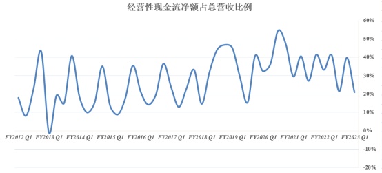由于支付了高额分手费,英伟达经营性现金流净额较去年同期有所缩减,但占总营收比例仍保持在20%+比例,对于英伟达这样一家需要在研发端耗费大量支出的企业来说算是较乐观水平。这一比例越高,意味着英伟达有更多资金用于研发等支出,进而不断提高自身竞争力。