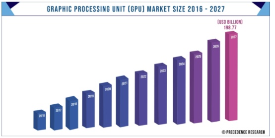 Precedence Research在预测报告中指出,基于高性能GPU硬件的游戏不断面世、数据中心、人工智能(AI)的发展趋势、虚拟现实(VR)和增强现实(AR)的牵引力,以及游戏笔记本和新型消费电子日益普及等因素预计将推动整个GPU市场规模增长。该机构还指出,蓬勃发展的可穿戴和便携式电子产品市场以及物联网(IoT)日益普及预计将在未来几年加速GPU市场规模增长。