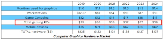 根据市场调研机构Jon Peddie Research公布的预测数据,预计全球PC游戏笔记本计算图形硬件(以独立显卡为主)市场总规模在2022年及2023年将无任何变化,2024年将小幅增长至380亿美元,相比2019年以前增幅已明显放缓。该机构预测游戏主机市场2022-2024年总体规模也将出现放缓,但英伟达管理层曾表示游戏主机(比如Xbox及PS系列)的利润率达不到预期目标,因此并未参与这一市场,AMD是这一市场的主要参与者。