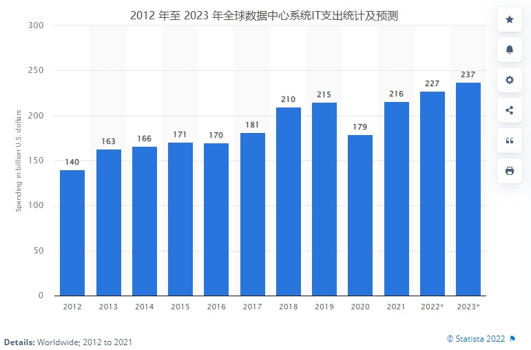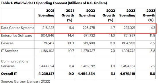 然而,数据中心市场未来可能是另一番景象,市场调研Gartner公布的预测数据显示,2022年全球数据中心系统IT类支出将达到2265亿美元,同比增长4.7%,2023年将达到2370亿美元。