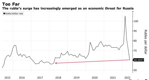 尽管西方国家对俄罗斯实施了全面制裁,但出口激增和资本管制削弱了该国对外汇的需求,使卢布飙升至2018年以来的最高水平。 俄罗斯政府为减缓卢布上涨速度所做的努力,包括本周早些时候放松关键的资本管制,不过,到目前为止都没有起到太大作用。