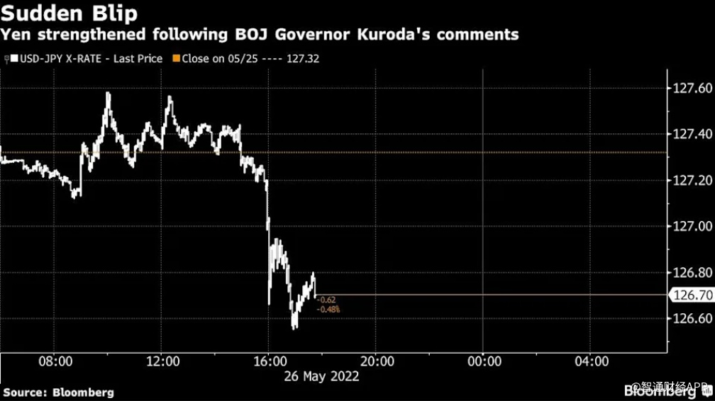 在黑田东彦发出上述言论后,美元兑日元汇率迅速从早些时候的127.18跌至126.66。本月早些时候,日元兑美元汇率曾一度跌至20年低点,为1美元兑131.35日元。不过,在避险需求的推升下,日元正加速回升。