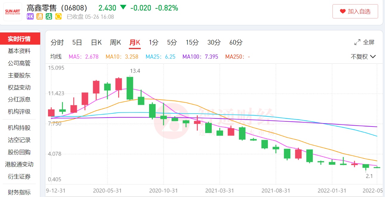 与此同时,行业上的发展压力也传导到高鑫零售的股价上了——自2020年7月2日股价到达13.4港元的高点之后,其股价开始步入下行“通道”,截止目前累跌逾80%,市值蒸发逾1045亿港元。
