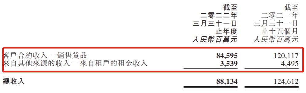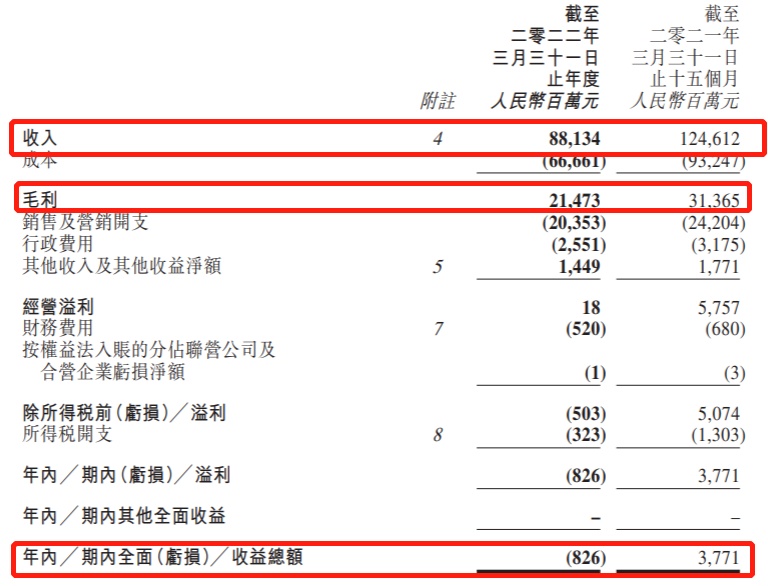 据财报数据显示,截至2022年3月31日止全年业绩,该公司实现全年收入为881.34亿元,同比下滑29.3%;净亏损为7.39亿元,去年同期赚35.72亿元,由盈转亏,而这也是其上市以来的首次亏损。