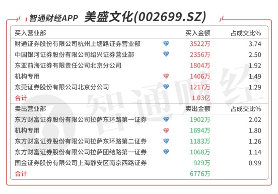 美盛文化(002699.SZ):龙虎榜阵容豪华,机构席位对倒净卖出288万元,买一是顶级游资上塘路的席位买入3444万元,买二是顶级游资赵老哥的席位买入2340万元,买五是知名游资的席位买入1158万元,当日净买入6086万元,该股今日突破所有均线强势涨停,后市可期。