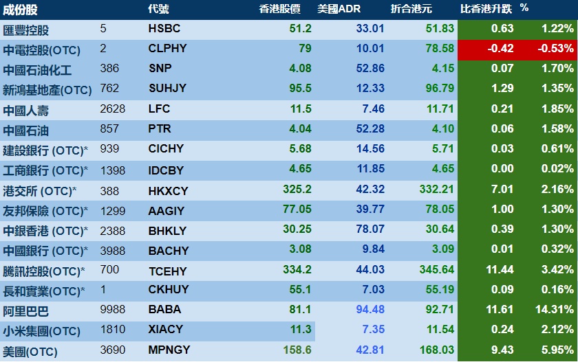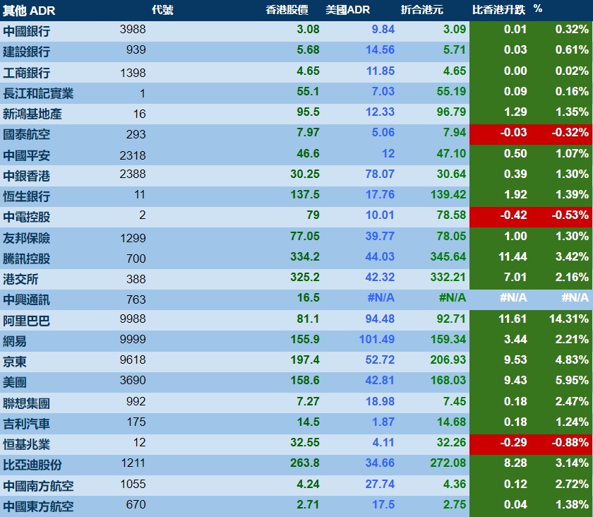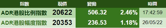 智通财经APP获悉,周四美股三大指数悉数上涨,港股ADR指数上涨,按比例计算,收报20622点,较香港收市涨506.32点或2.46%。