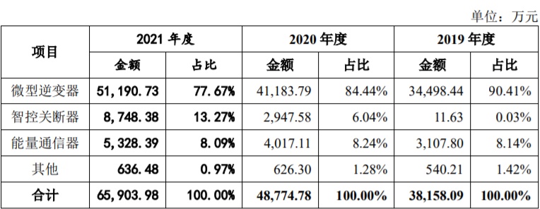 公司专注于光伏发电新能源领域,主要从事分布式光伏发电系统中组件级电力电子设备的研发、生产及销售,主要产品包括微型逆变器、智控关断器、能量通信及监控分析系统等。报告期内,公司主营业务收入来源于微型逆变器、智控关断器和能量通信器的销售,合计收入分别为37617.88万元、48148.48万元和65267.50万元,占比分别为98.58%、98.72%和99.03%。公司主营业务收入分产品类别分类如下:
