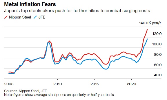 由于原材料价格飙升,新日铁及其国内同行JFE Holdings Inc.的炼钢部门在过去一年中已经将产品价格提高了一半,达到创纪录水平。全球大宗商品繁荣还使日本国内钢铁制造商能够通过与客户谈判确定的合同价格获得更好的条款,尤其是和通常具有更大议价能力的汽车制造商。
