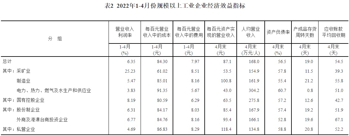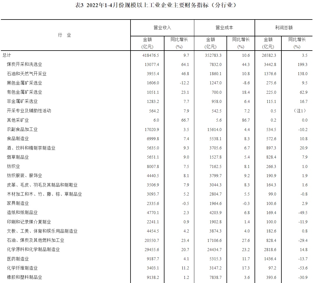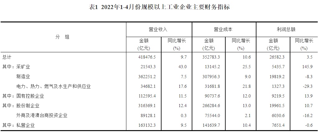 2022年1—4月份全国规模以上工业企业利润增长3.5%